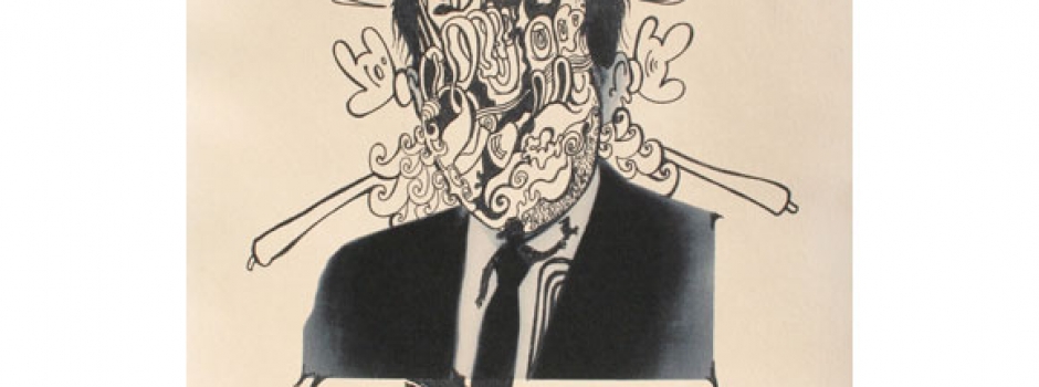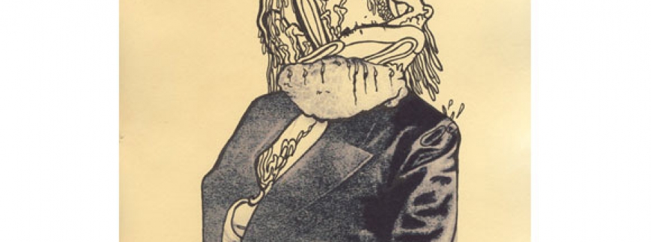 Stephen Tompkins Nixon (Arm Took a Coin = I am not a Crook) 8 ½ x 11 ink and inkjet collage on coffee-dyed cardstock