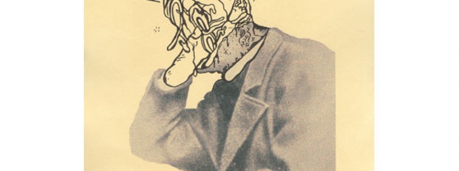 Stephen Tompkins Satie 8 ½ x 11 ink and inkjet collage on coffee-dyed cardstock